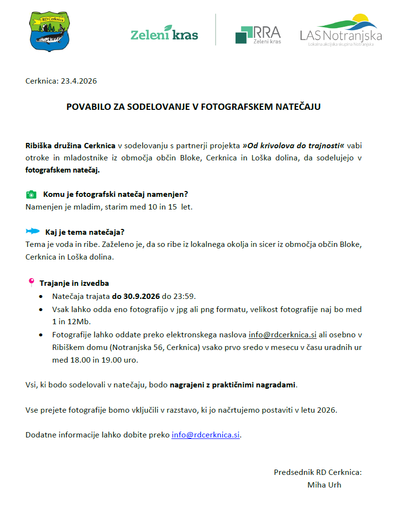 Ribiška družina Cerknica v sodelovanju s partnerji projekta »Od krivolova do trajnosti« vabi otroke in mladostnike iz območja občin Bloke, Cerknica in Loška dolina, da sodelujejo v fotografskem natečaj.